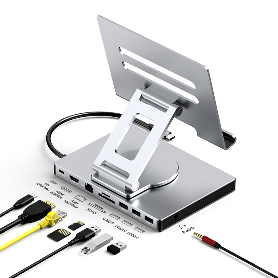 Optimiza tu espacio de trabajo con un stand y docking station versátil, que ofrece múltiples puertos y compatibilidad para tabletas y portátiles.